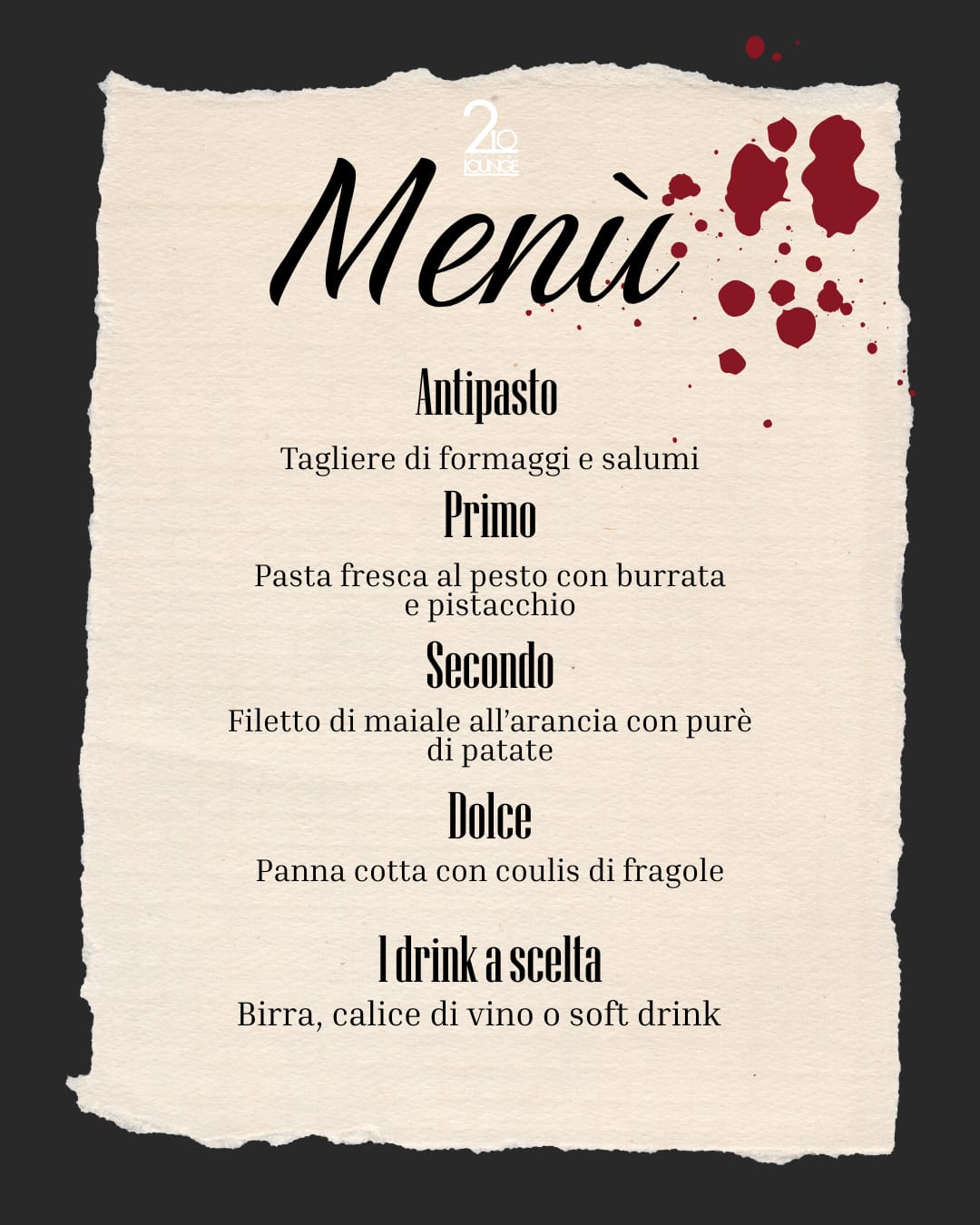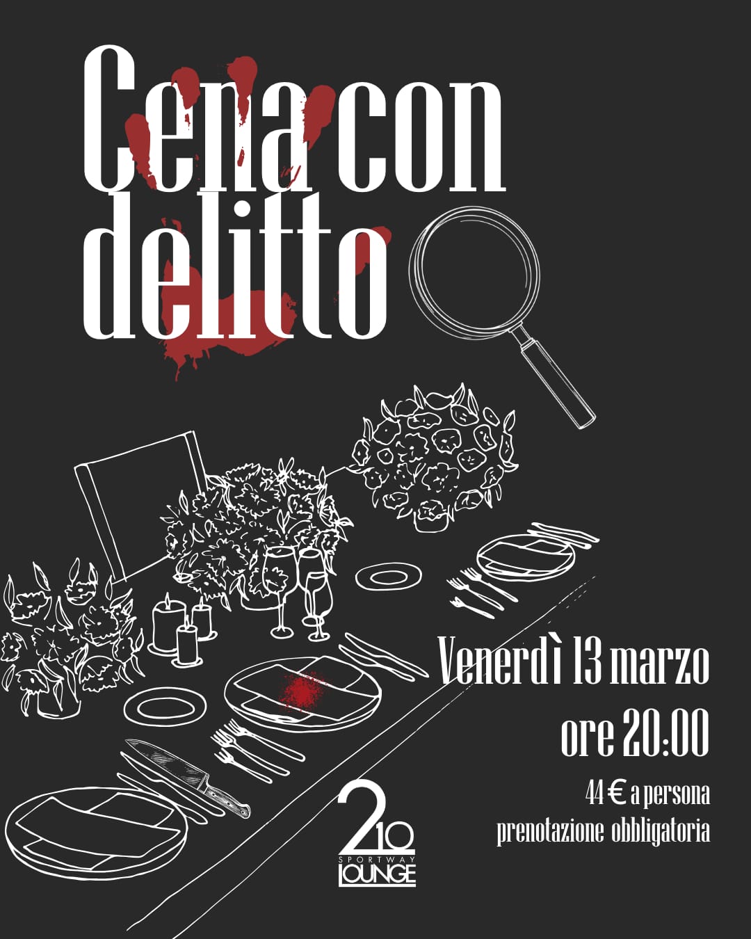 Venerdì 13 marzo, alle ore 20.00 al 210 Sportway Lounge ti aspetta la Cena con Delitto, uno spettacolo che ti coinvolgerà totalmente mentre gusti la cena pensata per te dal nostro chef (€44,00).
